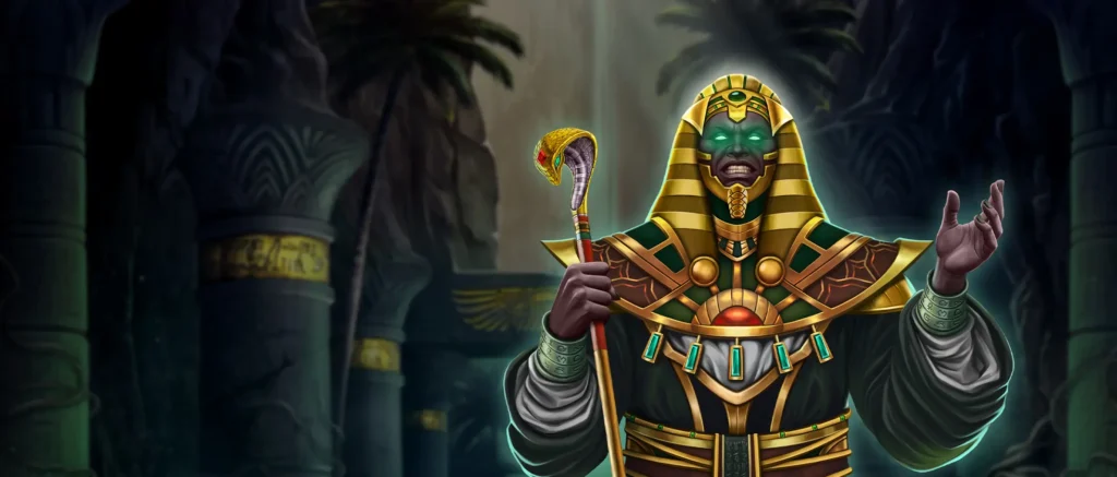 背景设定在神秘的埃及绿洲,古老的废墟与水池环绕其中,远方矗立着雄伟的金字塔。整体氛围略带阴森,使冒险感更加强烈。这种设定区别于一般沙漠风格,让玩家在 12BET 老虎机中体验到独特的异域气息。